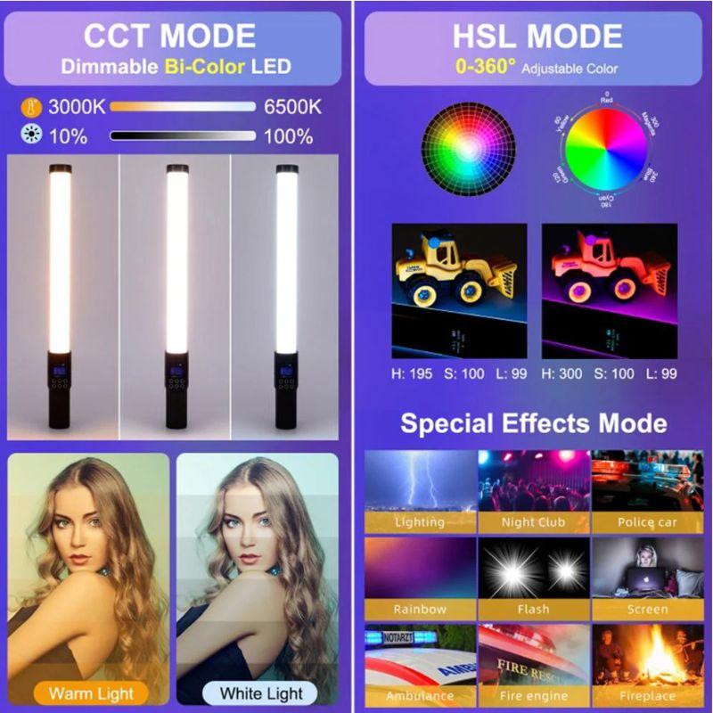 La varilla LED RGB ofrece una iluminación versátil y personalizable con colores RGB y una temperatura de color ajustable entre 3000k y 6500k. Su brillo se puede ajustar del 1% al 100%, adaptándose a diferentes necesidades y entornos.