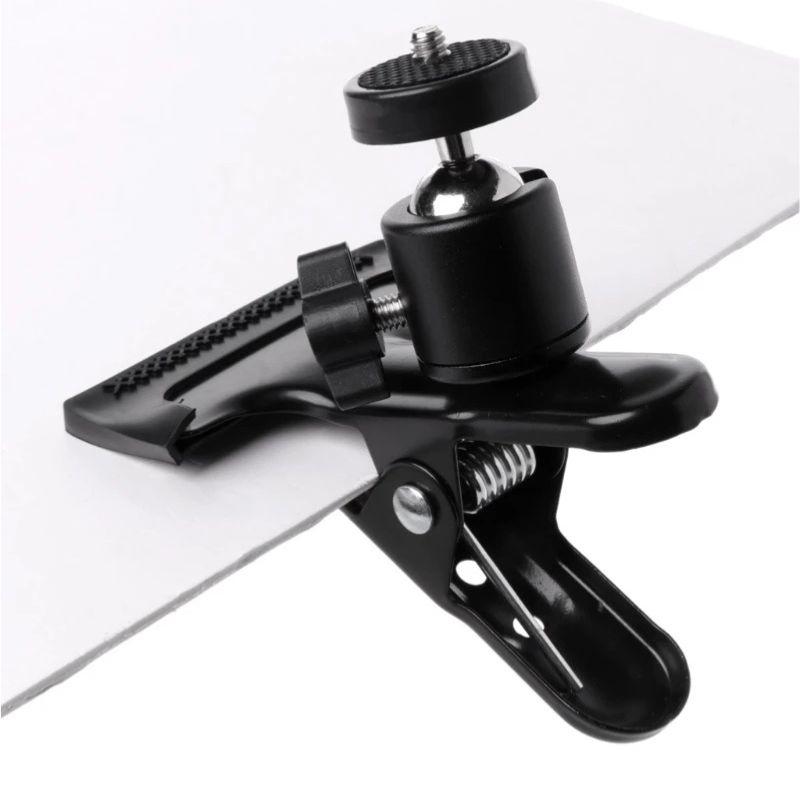 La plataforma superior utiliza un tornillo estándar de 1/4" y se puede fijar a una cámara digital como base. El clip se fija a una mesa o mesa de fotografía, lo que permite usar libremente la cámara u otros dispositivos.